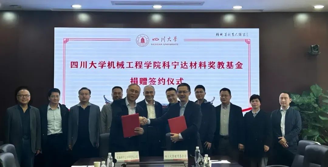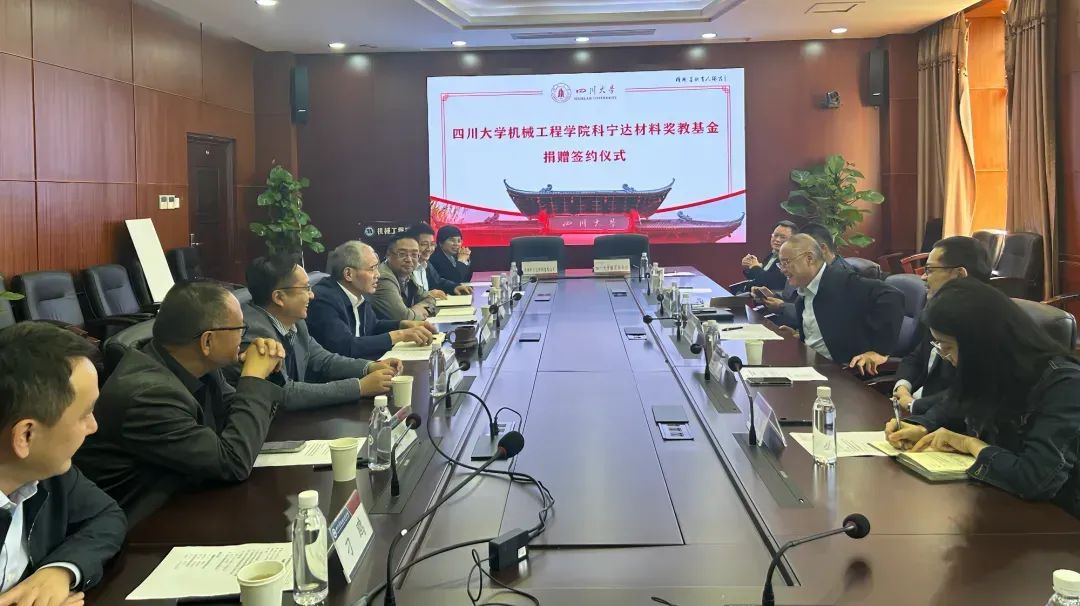 On November 4, 2024, the signing ceremony of the "Keningda Material Award Teaching Fund of the School of Mechanical Engineering, Sichuan University" was held in Room 208 of the Mechanical Engineering Building of Sichuan University. Li Ning, chairman of Chengdu Keningda Material Co., Ltd. and a retired professor of the School of Mechanical Engineering at Sichuan University, and his company's vice president, Liu Hongchuan, and project director, Li Rui, as well as Yang Guang, secretary general of the Sichuan University Education Foundation, vice director of the project department, Jiang Liangxiao, and Gao Qing, secretary of the Party Committee, Zhang Yi, vice dean of the School of Mechanical Engineering, Yu Deping, vice dean of the School of Mechanical Engineering, Xiong Ji, director of the professor committee, Dian Guo, and relevant teachers from the Material Forming and Control Engineering Department of the School of Mechanical Engineering were present at the signing ceremony.